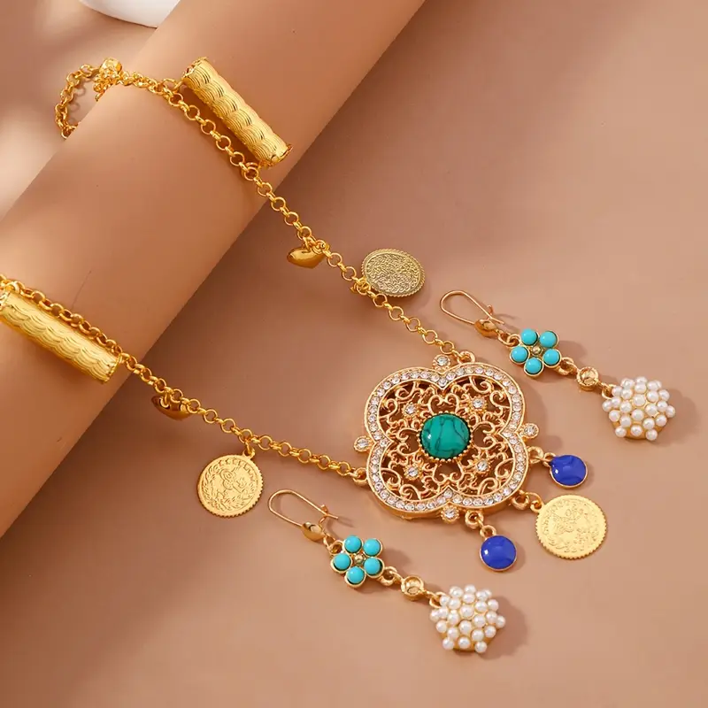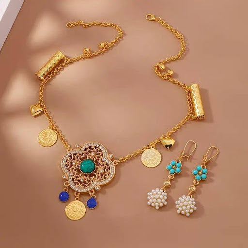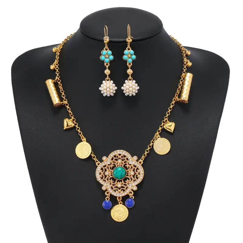 18K Plated Alloy Jewelry Set - Simple Hip Hop Style with Imitation Pearl Mosaic - Turquoise Accent Floral Filigree Necklace and Earrings Set for Daily and Party Occasions
