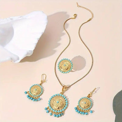 Vintage Style, 22K Golden Plated Copper Alloy with Blue Stone Tassel, Round Pendant Necklace, Earrings, Ring Jewelry Set for Women, Daily Wear, Gift, All-Season Accessory