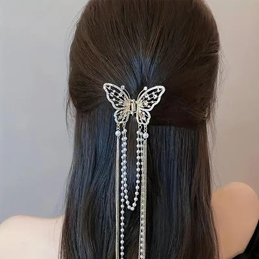 Butterfly Shark Clip Imitation Pearl Chain Tassel Hair Claw Clip
